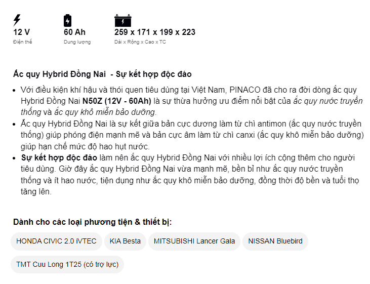 Ắc quy Đồng Nai nước 12V-60Ah (N50Z)