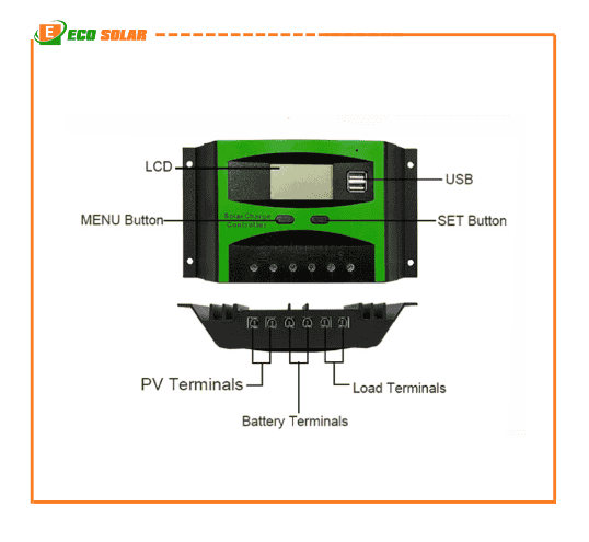 – Đặc điểm nổi bật của bộ điều khiển sạc PWM (Solar Charge Controller) là hiển thị dòng sạc Ah, tự động nhận diện điện áp ắc quy 12V hay 24V để đưa điện áp sạc phù hợp cho Ắc Quy.
