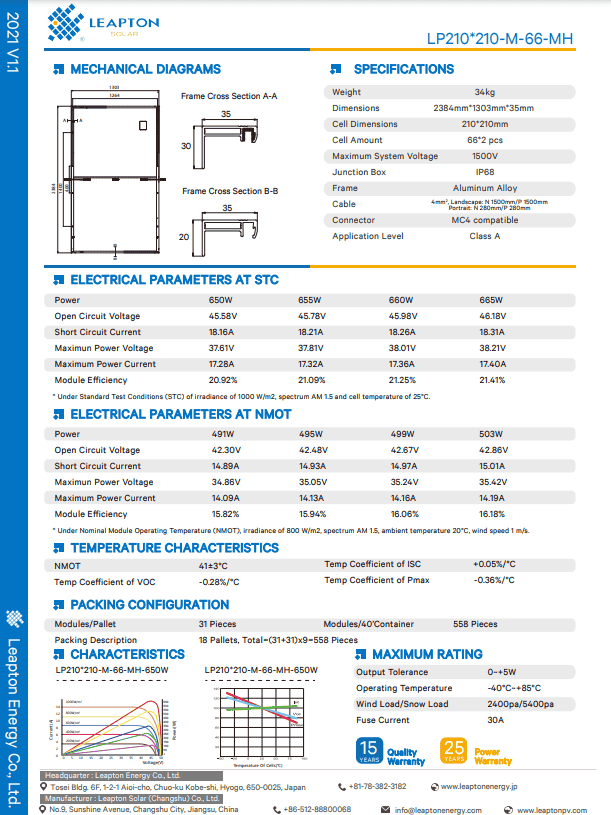 Tấm pin năng lượng mặt trời Leapton Solar 650W là sản phẩm pin năng lượng mặt trời thế hệ mới của hãng sản xuất LEAPTON – Nhật Bản thuộc dòng họ Mono Hafl-Cells với hiệu suất cao nổi trội, cùng nhiều tính năng ưu việt khác. Leapton 650W là dòng pin năng lượng mặt trời đơn tinh thể được sản xuất theo công nghệ hiện đại 9 Busbar và được các nhà nghiên cứu chia nhỏ các ô pin với mục đích cho hiệu suất tốt nhất và đã thành công như mong muốn.