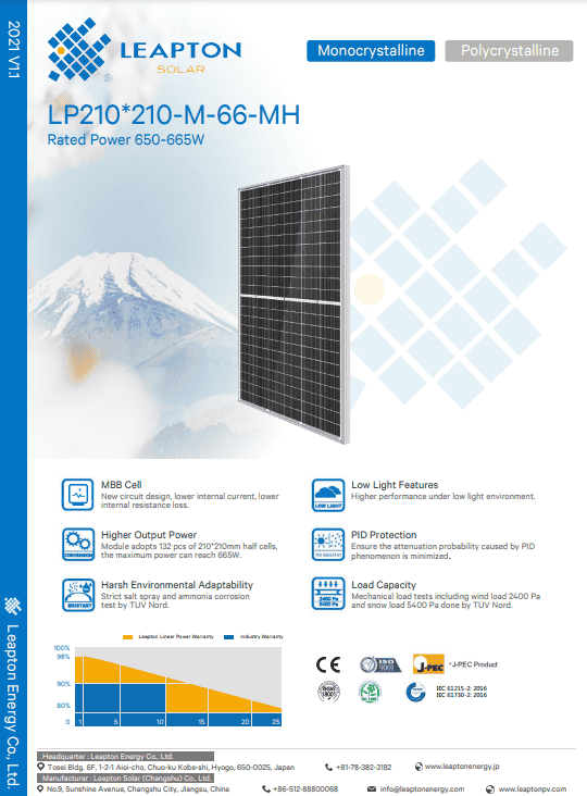 Tấm pin năng lượng mặt trời Leapton Solar 650W là sản phẩm pin năng lượng mặt trời thế hệ mới của hãng sản xuất LEAPTON – Nhật Bản thuộc dòng họ Mono Hafl-Cells với hiệu suất cao nổi trội, cùng nhiều tính năng ưu việt khác. Leapton 650W là dòng pin năng lượng mặt trời đơn tinh thể được sản xuất theo công nghệ hiện đại 9 Busbar và được các nhà nghiên cứu chia nhỏ các ô pin với mục đích cho hiệu suất tốt nhất và đã thành công như mong muốn.