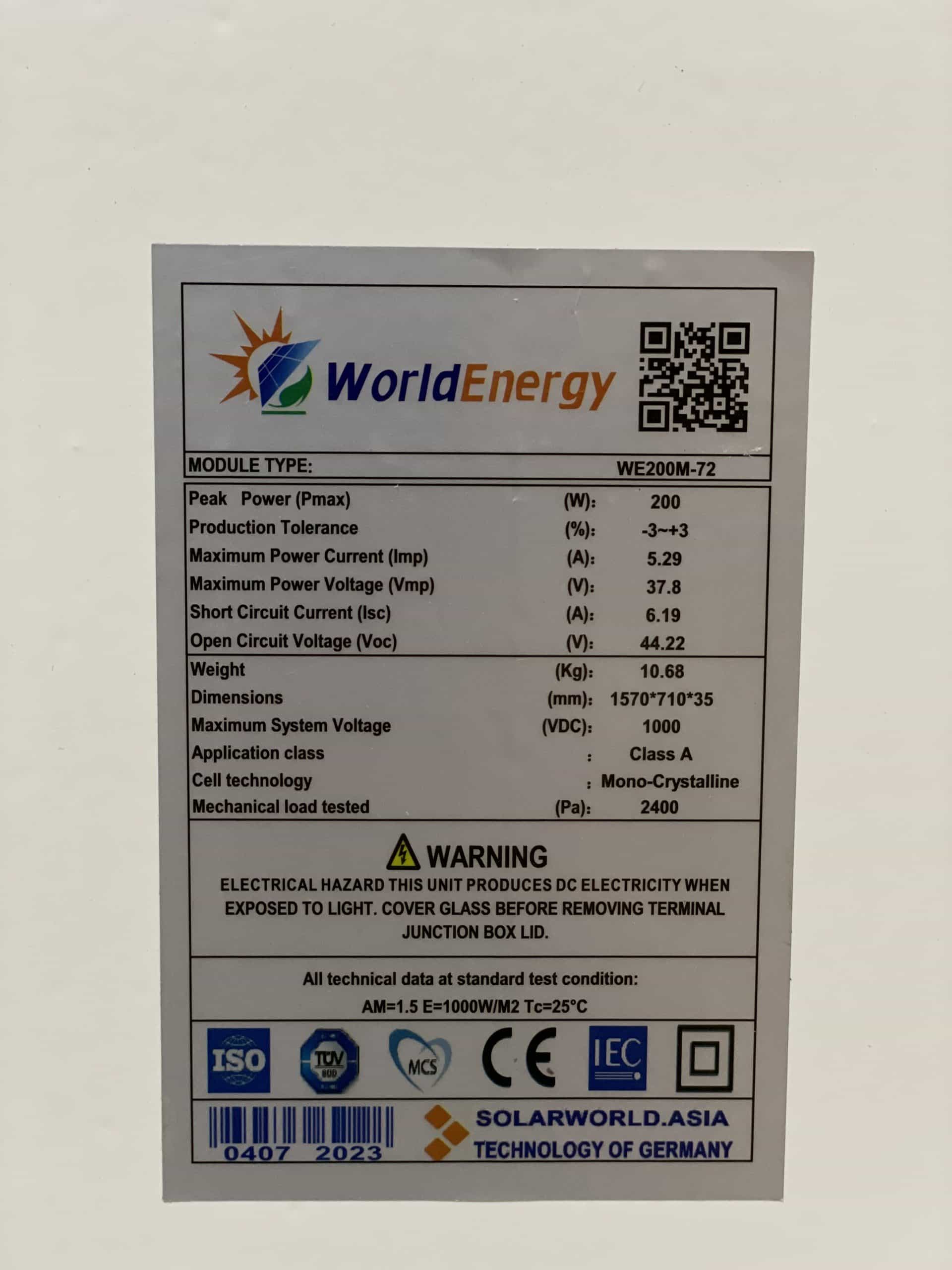 Thông số kỹ thuật TẤM PIN NĂNG LƯỢNG MẶT TRỜI MONO 200W WORLD ENERGY